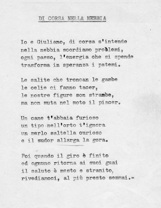 Luciano Topini, atleta del GS Cappuccini, non lo vediamo da qualche anno sulle nostre strade. Ha partecipato a molte gare podistiche tra cui il Passatore. Dal 1980 al 1990 ha corso una trentina di maratone, con tempi anche vicini alle 3 ore. Spesso con una sigaretta in mano e sempre disposto ad una buona bevuta, amico di tutti ed in particolare del maratoneta Giuliano Manenti. E tra le foto d' archivio di Giuliano, spulciate per l'albo, è rispuntata una poesia.